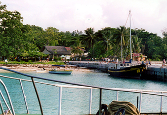 Taxin släppte av oss på kajkanten. En motordriven skonaren agerade färja till lilla hamnen Baie St Anne på Praslins östra sida. Av och pålastning skedde i hög fart och båten låg inte i hamn mer än tio minuter.