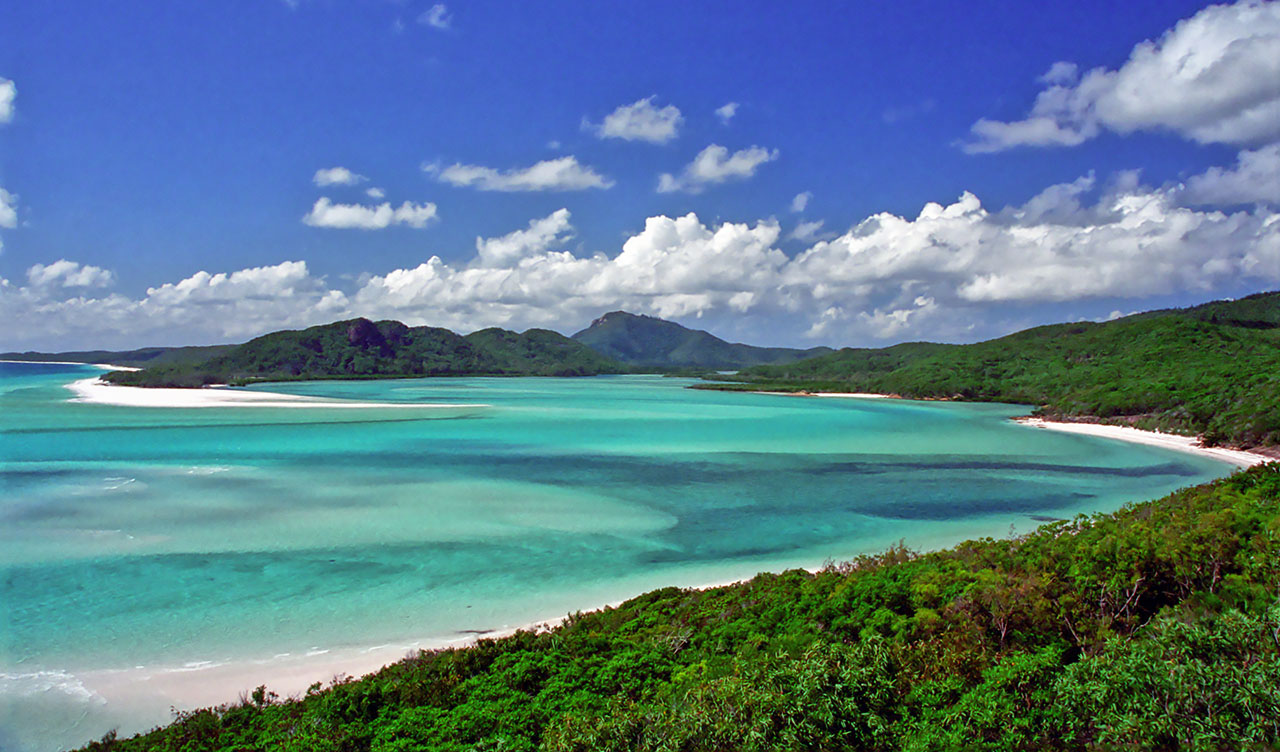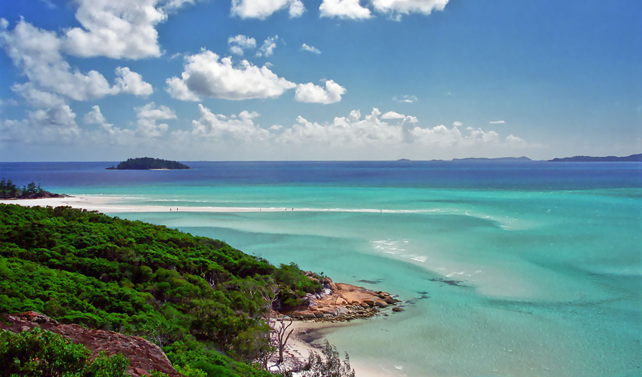 När vi kom fram till Tounge Bay blev vi transporterade i omgångar till stranden i den lilla gummibåten. Via en vandringsled tog vi oss fram till utsiktsplatsen över Whithaven Beach. Vyn var så otroligt vacker och många gånger mer storlagen än vad vi sett på vykorten tidigare.
