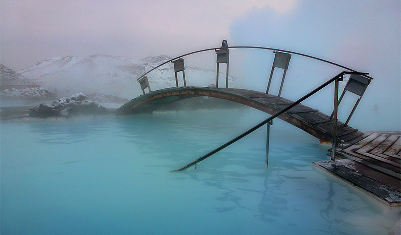 En gångbrygga över varma vattnet i Blå Lagunen, Grindavík Island