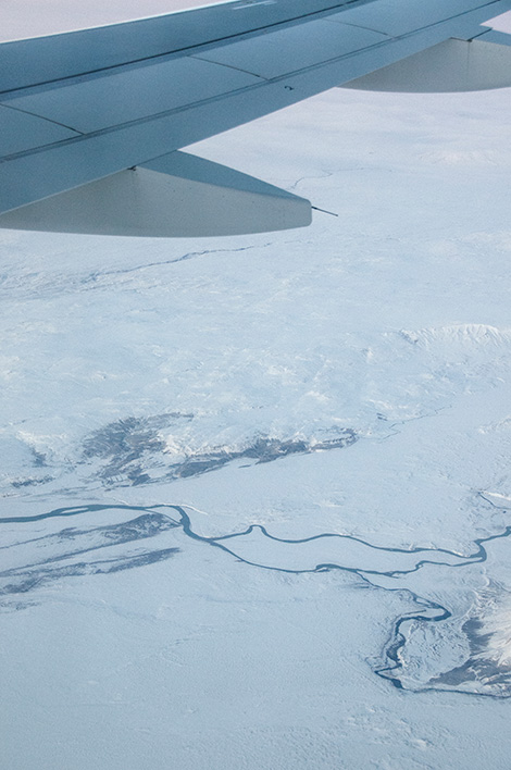 Vatten som plöjer fram genom is och snö, Island från ovan