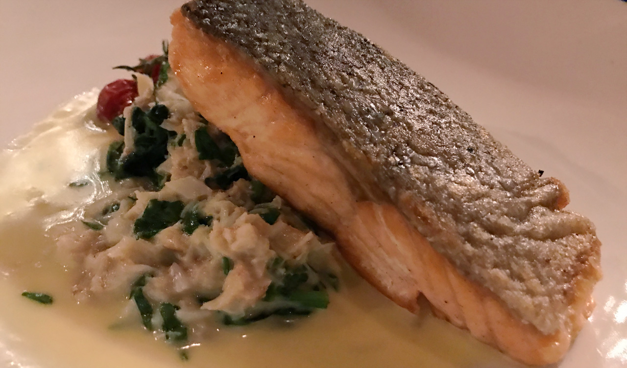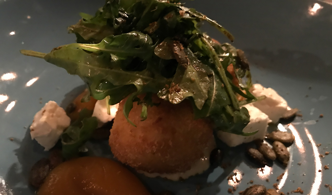 Men vi valde ändå olika vilket gav oss möjligheten att se vad alternativet innebar. Till förrätt valde Anki en getost pannacotta medan Lars valde risotto bollar på pumpa. Vi lät dem rekommendera viner som passade väl till varje rätt. Till huvudrätt valde Anki en oxfilé med tomater, sallad och pepparsås och Lars en stekt lax med spenatsallad. Som sideorder tog vi in gröna bönor i citronolja och quinoa samt hemlagade fries. Allt var utsökt gott!