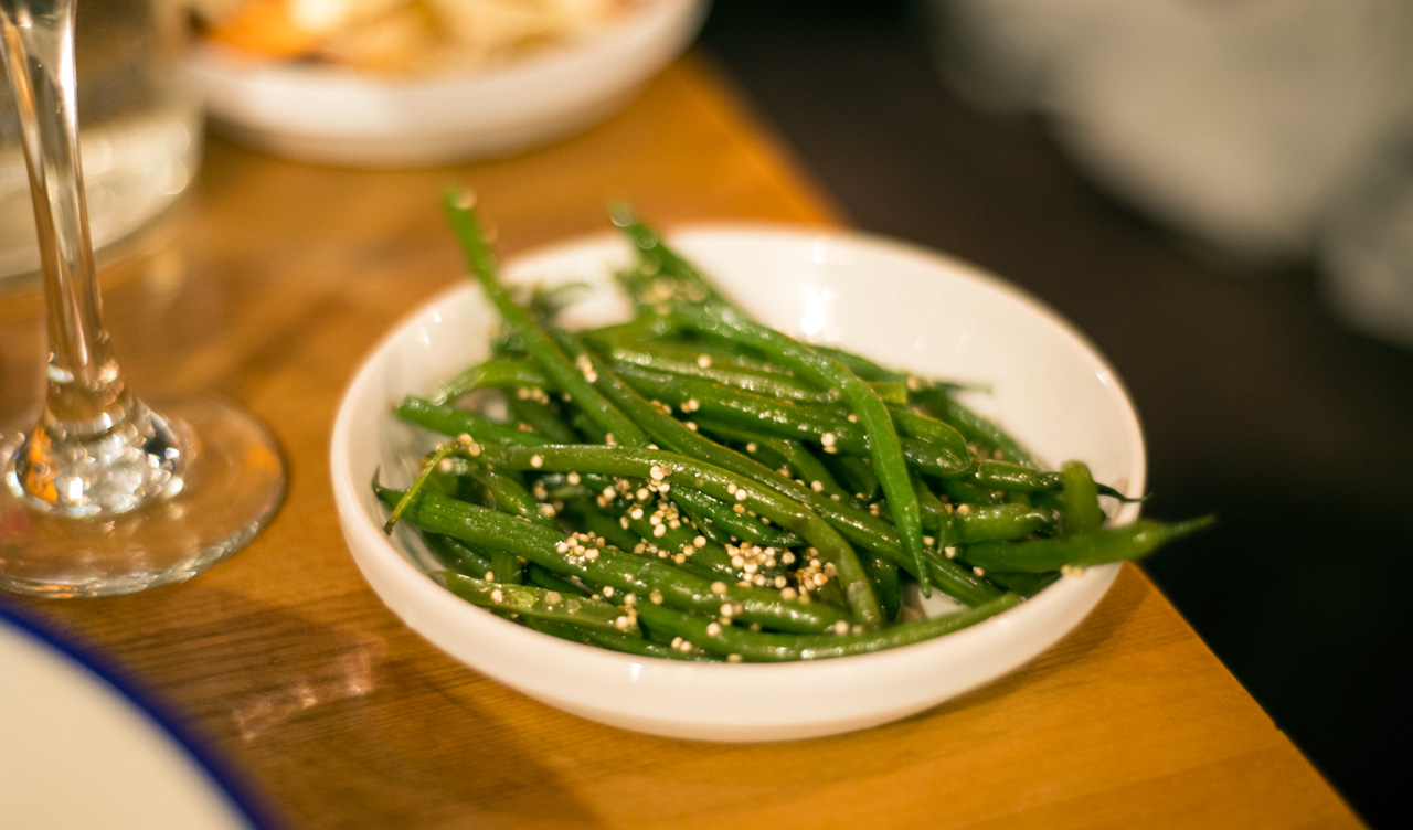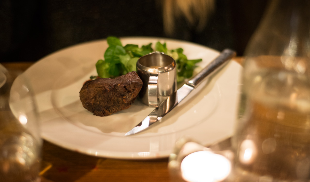 Väggen bakom vårt bord bestod av fönster, upplysta bakifrån med gult ljus och dekorerat med köttyxor. Varje del av middagen gav flera alternativ och de lät alla goda och gjorde det nästan svårt att välja.