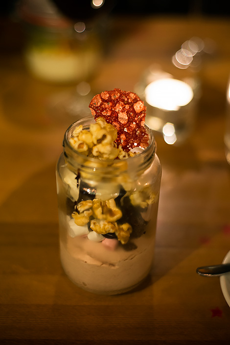 Som avslutning på själva middagen fick Anki en yoghurt och vanilj pannacotta med passionfrukt och Lars en choklad brownie sundae med popcorn. Båda rätterna serverades i en glasburk. När vi ätit upp fick vi frågan om vi kunde tänka oss att sätta oss i baren, då de hade fler matgäster som gärna ville ha bord. Det var helt OK med oss och eftersom det börjat regna ute hade vi inte bråttom.