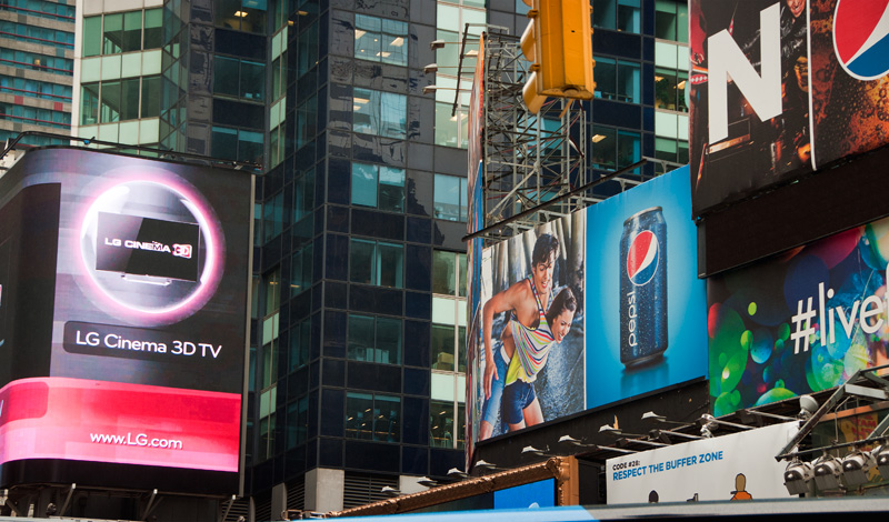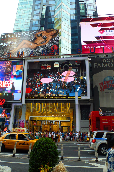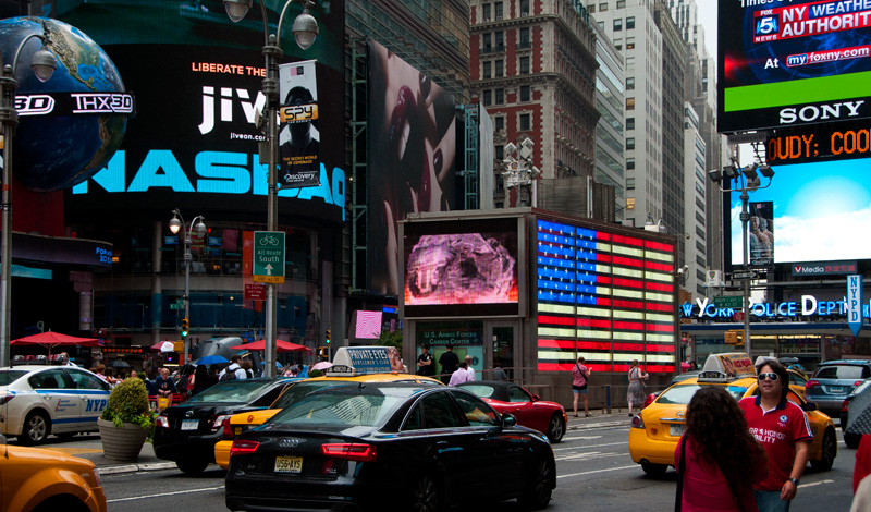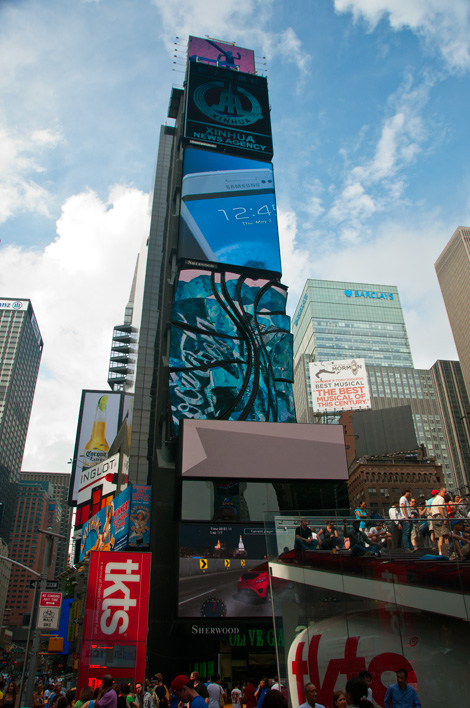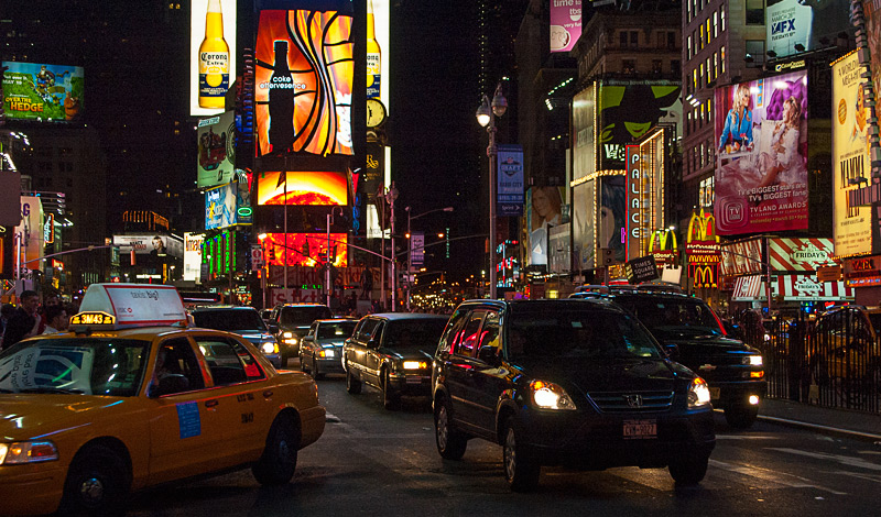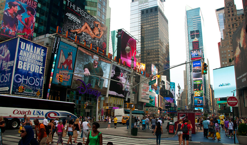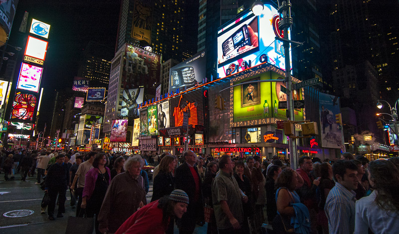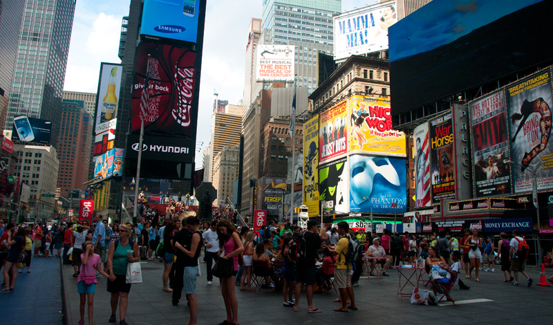 Få platser i världen kan mäta sig med Times Square när det gäller att känna av stadspuls dränkt i neon; en metropol som få andra. Det största upplevelsen är en sen kväll, gärna efter att de flesta besökare har lämnat platsen. De stora skyltarna längs husväggarna marknadsför såväl butiker och stora varumärken som lokala musikaler och shower.