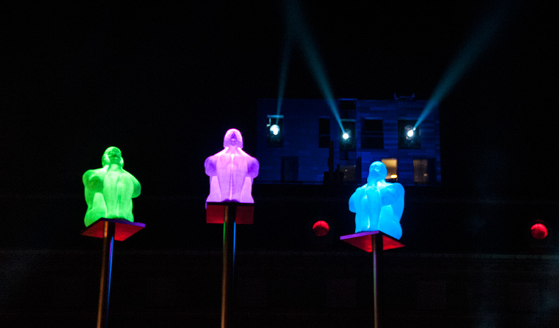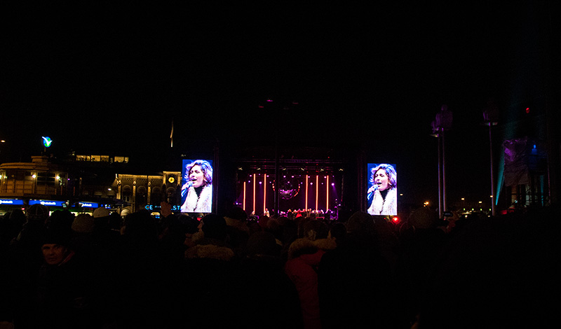 Han avslutade sitt tal med att introducera Norges kanske största stjärna; Sissel Kyrkjebö som intog scenen med en stor kör och framförde en sång som var en variant av My med ett stänk gospel och soul . De tre lysande statyerna, av spanska konstnären Jaume Plensa, som sitter på höga pelare vid hotellet hade nu tänts upp och skiftade i klara färger, det kommer bli ett exotiskt inslag på torget. Alla som varit i Nice på senare år kan känna igen dem från Masséna torget mitt i staden (se foto från Nice: Outdoor art at Place Masséna, Nice France)