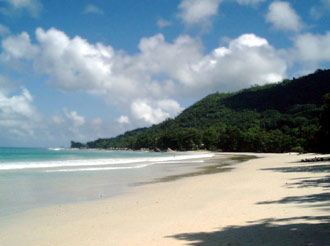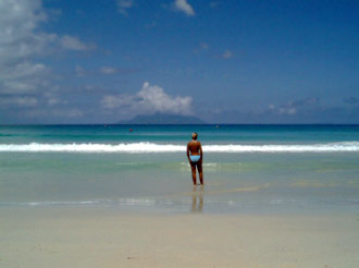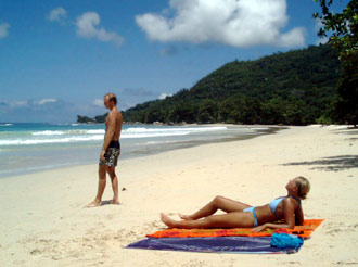 Den buss vi väntade på var nummer 20 från SPTC bussarna för att kunna ta oss runt från nordöst till nordväst. Efter en kvart dök den upp och efter en ungefär lika lång tur släppte chauffören av oss, på Mahes mest kända stand Beau Vallon.