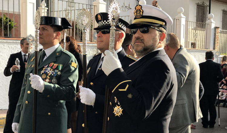 På väl utvalda platser står Policia Local, någon ur lokala polisen och ser till att inga bilar kommer körandes längs vägen processionen går. Längst bak i processionen gick lokalbefolkning.