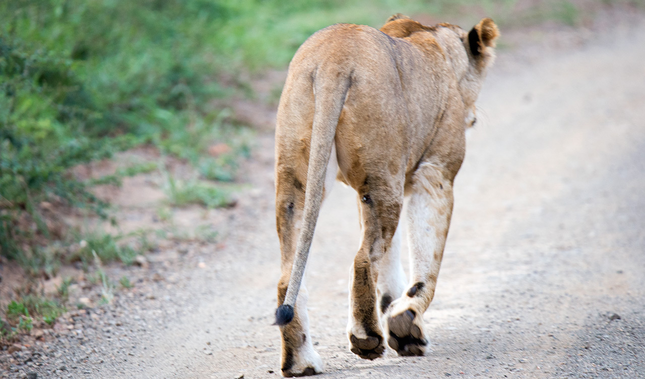 De ställde sig upp och spanade lite till lojt och började gå sakta längs vägen. Pieter följde dem med bilen på behörigt avstånd. De stannade till och efter kort stund började de gå åt vårt håll. Lejonhonorna passerade precis intill bilen på bara någon meter eller två från oss.