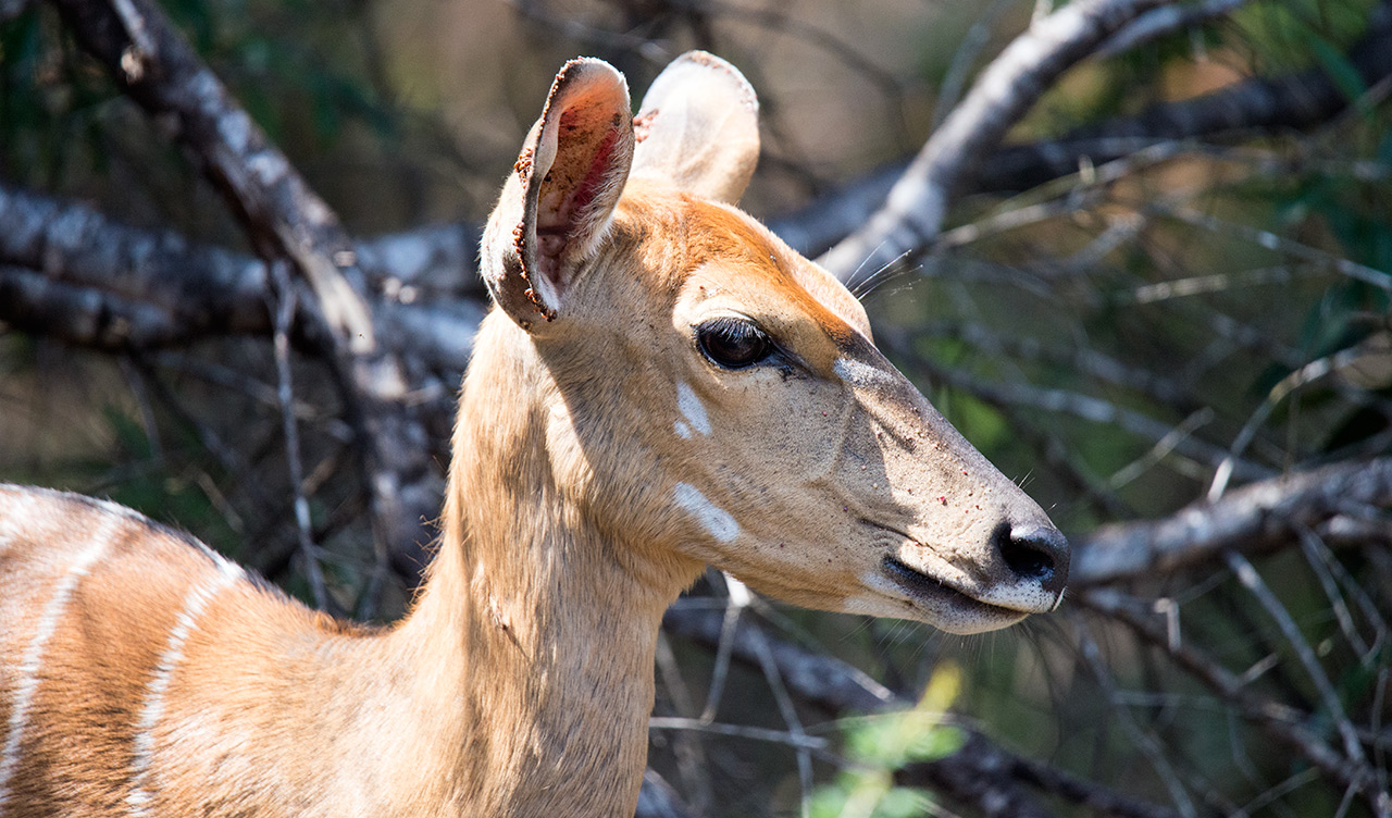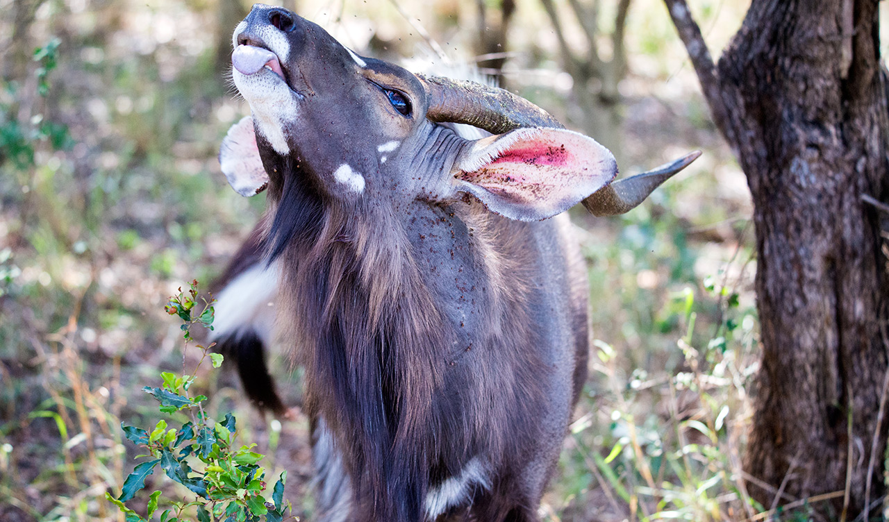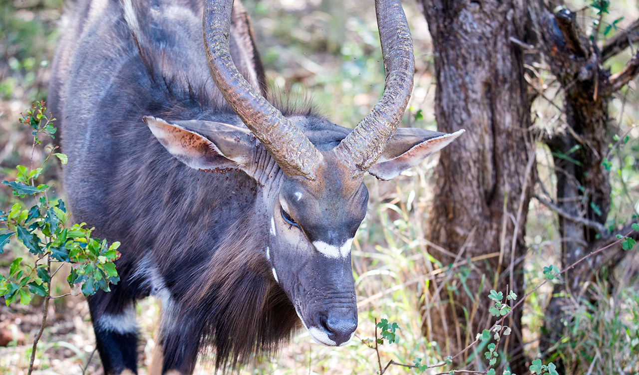 När vi skulle gå tillbaka till villan ville personalen vi skulle ha någon med oss eftersom vilda djur ofta rörde sig igenom området. Pieter följde med oss och halvvägs till villan bromsade vi in då bara några få meter från oss stod en stor Nyala hane, en antilop med långhårig mörk päls och med stora horn. Den verkade inte bry sig så mycket om oss, den stod och tuggade på något. Den höll sig helt lugn och började klia sig bakom örat med bakbenet.